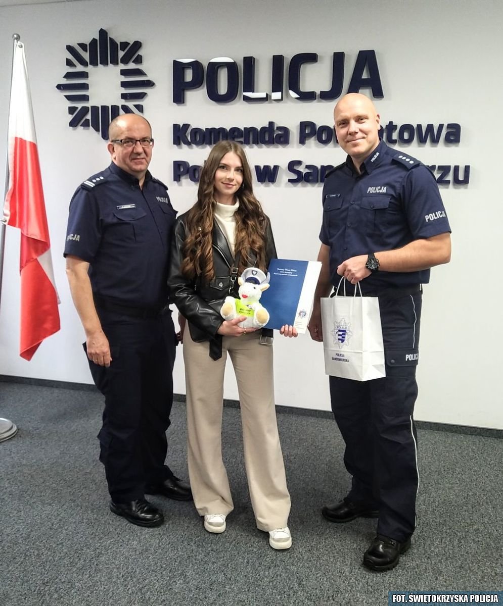 Za pozytywne i godne naśladowania zachowanie Komendant Powiatowy Policji w Sandomierzu insp. Ryszard Komański osobiście podziękował Pani Oldze. Podczas dzisiejszego spotkania komendant wraz ze swoim zastępcą przekazał kobiecie list gratulacyjny oraz wyraził słowa uznania za jej zaangażowanie, empatię oraz obywatelską postawę.