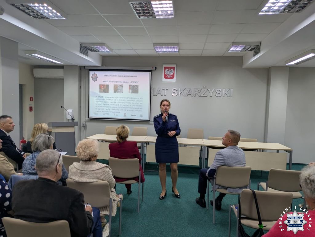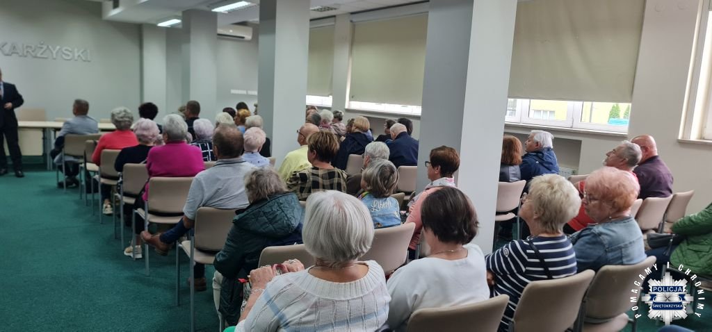 Powiat skarżyski jest kolejnym miejscem na mapie województwa świętokrzyskiego, gdzie odbyło się spotkanie edukacyjne dla seniorów w ramach pilotażowego programu edukacyjnego Ministerstwa Sprawiedliwości skierowanego do osób w wieku 60 +. Program realizowany jest przy współudziale rządowych ministerstw, wojewody świętokrzyskiego, lokalnych samorządów, Naukowej i Akademickiej Sieci Komputerowej oraz policji. Celem projektu jest budowanie świadomości prawnej seniorów oraz wzmocnienie ich kompetencji w zakresie rozpoznawania zagrożeń, korzystania z przysługujących im praw i dostępnych form pomocy państwowej. W części inauguracyjnej głos zabrał m.in. Pierwszy Zastępca Komendanta Wojewódzkiego Policji w Kielcach insp. Tomasz Jarosz, który podkreślił znaczenie podejmowanych działań na rzecz poprawy bezpieczeństwa osób starszych oraz kontynuowanie przedsięwzięć profilaktycznych mających na celu zapobieganie oszustwom, popełnianym na ich szkodę. Przypominał, aby w kontakcie z obcym nie ulegać emocjom. Oszuści często posługują się metodą tzw. „na legendę”, której celem jest doprowadzenie do przekazania im środków finansowych. Przypominał również, jak ważna jest zmiana numeru telefonu stacjonarnego, często wykorzystywanego przez sprawców do prowadzenia procederu przestępczego. Pamiętajmy, że stare książki telefoniczne zawierają nasze dane osobowe, łącznie z adresem zamieszkania.