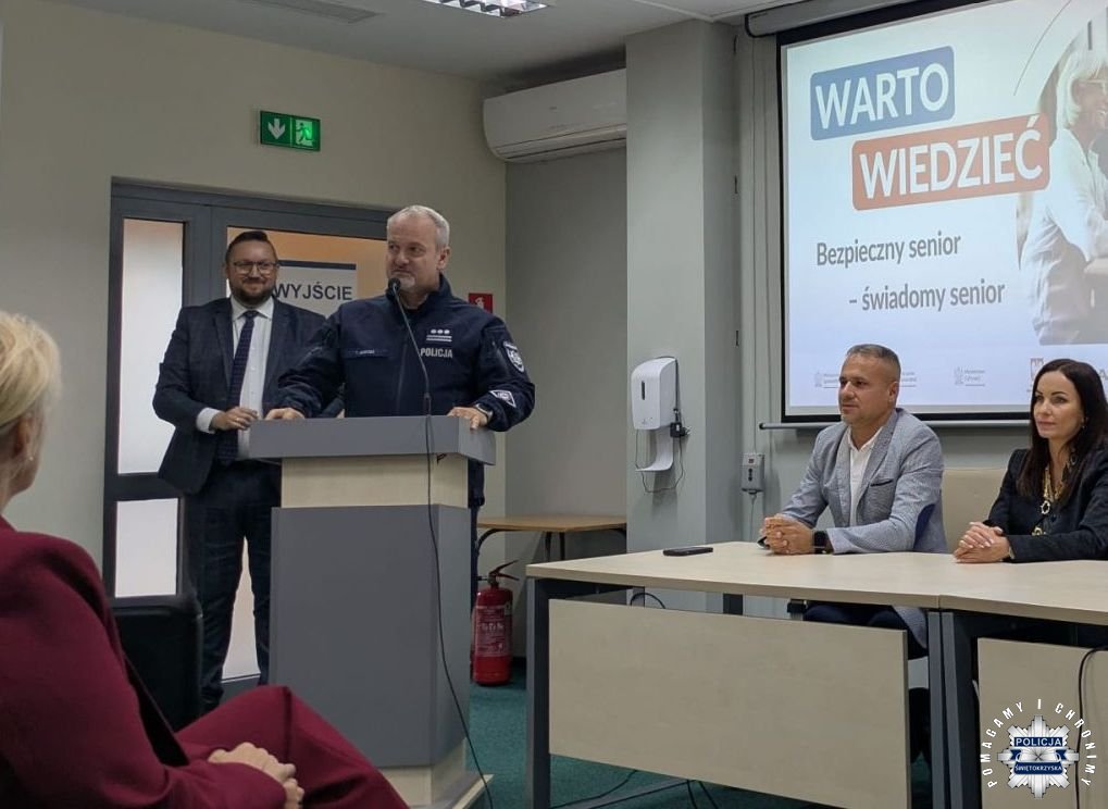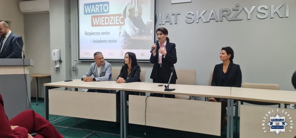 Warto wiedzieć! – to hasło wczorajszego spotkania edukacyjnego w ramach pilotażowego programu Ministerstwa Sprawiedliwości pn. „BEZPIECZNY SENIOR – ŚWIADOMY SENIOR” skierowanego do osób w wieku 60 +, które odbyło się w sali konferencyjnej Starostwa Powiatowego w Skarżysku - Kamiennej. W wydarzeniu udział wzięli m.in. Pani Marzena Okła-Drewnowicz, Sekretarz Stanu w Kancelarii Prezesa Rady Ministrów, Pani Magdalena Rams – Zastępca Dyrektora Departamentu Funduszy i Nieodpłatnej Pomocy Prawnej w Ministerstwie Sprawiedliwości, Pan Łukasz Mucha – Dyrektor Biura Wojewody w Świętokrzyskim Urzędzie Wojewódzkim w Kielcach, Pan Artur Berus – Starosta Skarżyski oraz funkcjonariusze z miejscowej jednostki na czele z Pierwszym Zastępcą Komendanta Wojewódzkiego Policji w Kielcach insp. Tomaszem Jaroszem.