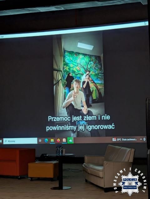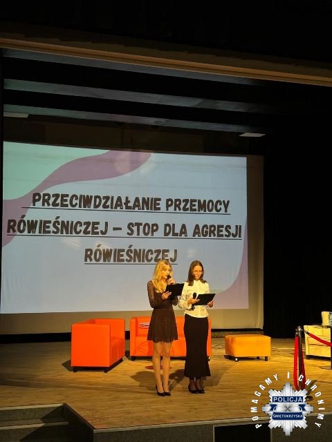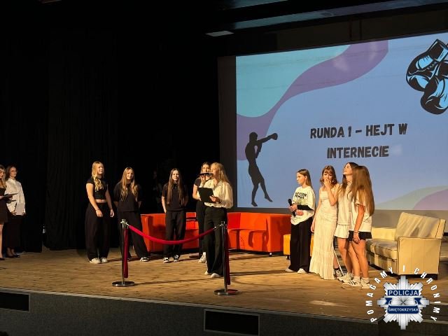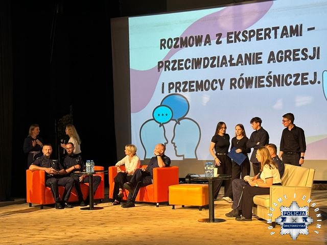 Włoszczowscy dzielnicowi wzięli udział w spotkaniu profilaktycznym organizowanym w ramach projektu „Stop dla agresji i przemocy rówieśniczej” w Domu Kultury we Włoszczowie. Funkcjonariusze podczas jednego z segmentów spotkania, czyli debaty, odpowiadali na pytania zadawane przez młodzież z I Liceum Ogólnokształcącego im. gen. W. Sikorskiego we Włoszczowie. Poruszane były takie tematy jak: skąd może brać się hejt i dlaczego młodzież wchodzi na taką drogę, czy w sieci jest się całkowicie anonimowym, jak pomóc osobom, które dotyka przemoc rówieśnicza oraz jak samemu sobie radzić z różnymi formami przemocy.