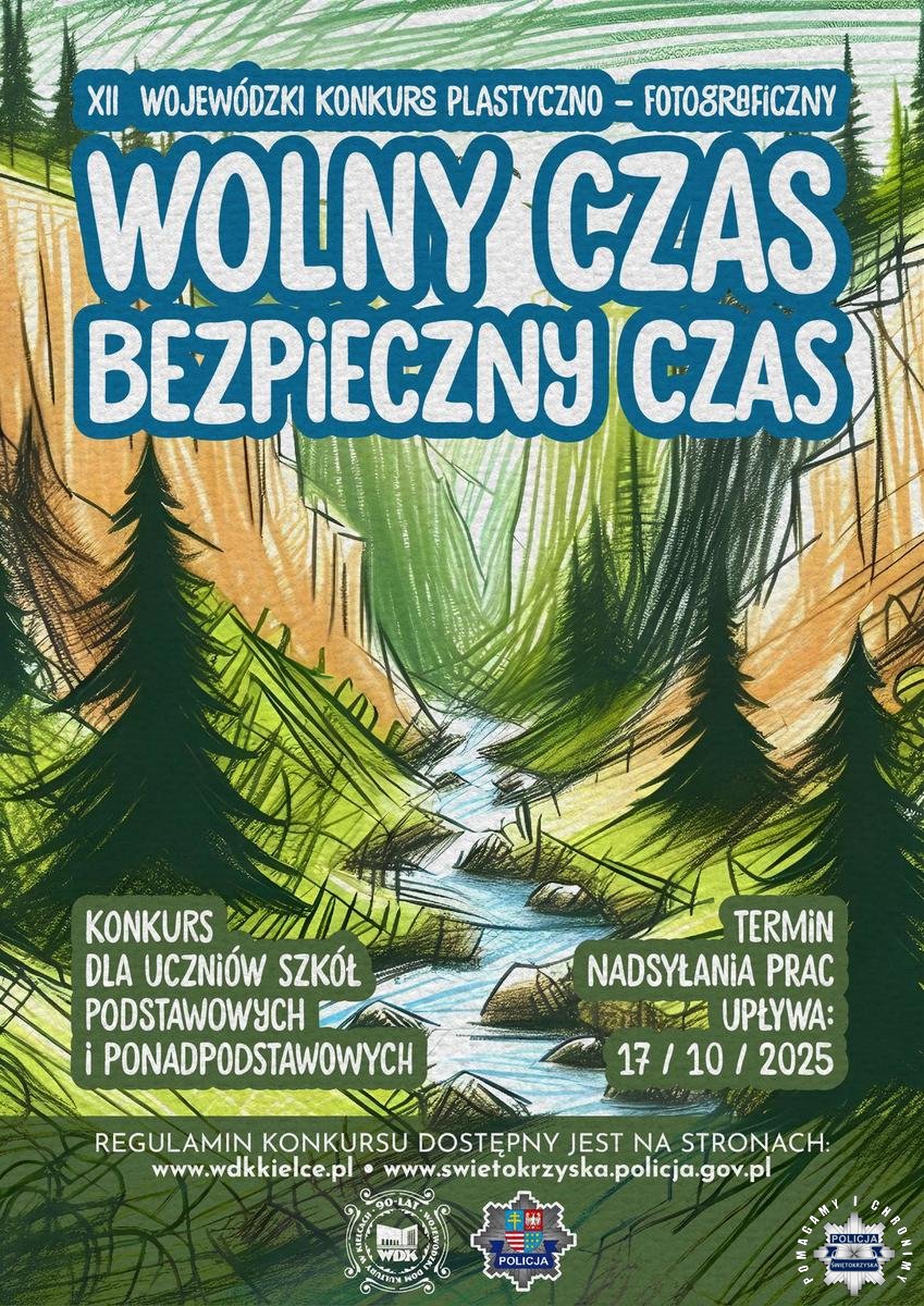 Komenda Wojewódzka Policji w Kielcach i Wojewódzki Dom Kultury zapraszają do udziału w XII Wojewódzkim Konkursie Plastyczno-Fotograficznym „Wolny czas – bezpieczny czas", który jest skierowany do uczniów szkół podstawowych i ponadpodstawowych woj. świętokrzyskiego. Prace konkursowe można nadsyłać do 17 października 2025r.