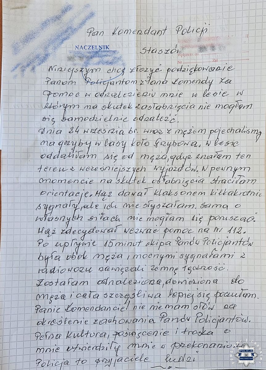 Końcem września bieżącego roku staszowscy policjanci otrzymali zgłoszenie od starszego mężczyzny, który poinformował, że jego 83-letnia żona, podczas grzybobrania zagubiła się w lesie. Dodatkowo mężczyzna przekazał, że po telefonicznym kontakcie, żona przekazała mu, że źle się czuje i nie wie gdzie jest. Na miejsce skierowani natychmiast zostali będący w dyspozycji dyżurnego policjanci, którzy podjęli działania zmierzające do jak najszybszego odnalezienia seniorki. W niespełna godzinę od zdarzenia zagubiona kobieta cała i zdrowa przekazana została pod opiekę męża.