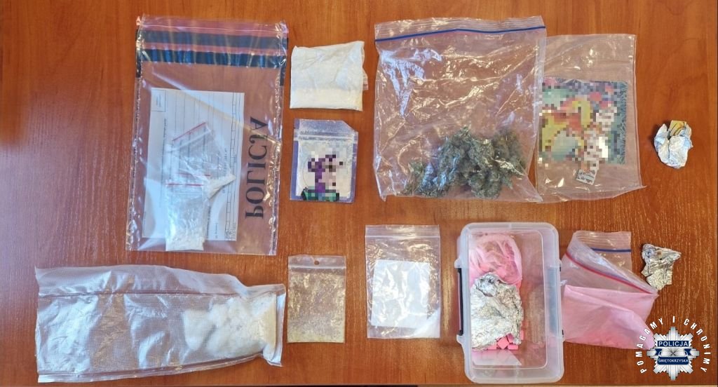 Policjanci staszowskiej jednostki w minioną środę zostali powiadomieni o tym, że w jednej z placówek handlowych na terenie miasta doszło do kradzieży sklepowej. Na miejsce skierowani zostali funkcjonariusze, którzy w rozmowie z pracownicą ochrony ustalili, że nieznany jej mężczyzna dokonał kradzieży produktów spożywczych, a gdy wyszła za nim i próbowała go zatrzymać, doszło między nimi do przepychanki. W trakcie szarpaniny mężczyźnie została wyrwana reklamówka, po czym złodziej na rowerze oddalił się miejsca zdarzenia. W trakcie dalszych ustaleń okazało się, że ten sam człowiek dokonał kradzieży w innych pobliskich sklepach, a wyrwana reklamówka skrywała niedozwolone substancje - blisko 14 gramów mefedronu, 31 sztuk tabletek extazy i ususzonego grzyba halucynogennego.