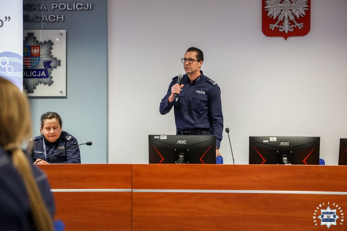 Ważnym punktem spotkania była prezentacja projektu „Siła w równowadze – odNowa”, który realizuje Komenda Wojewódzka Policji w Kielcach w ramach programu Fundusze Europejskie dla Świętokrzyskiego 2021–2027, współfinansowanego ze środków Europejskiego Funduszu Społecznego. Projekt obejmuje 750 funkcjonariuszy i pracowników Policji, a jego wartość wynosi 683 585 zł, z czego 90% to dofinansowanie unijne w wysokości 613 367 zł. Zakłada on m.in. eliminowanie zdrowotnych czynników ryzyka w miejscu pracy, wspieranie dobrostanu psychicznego poprzez szkolenia antystresowe i profilaktyczne, a także poprawę ergonomii stanowisk pracy poprzez zakupy nowego wyposażenia biurowego.