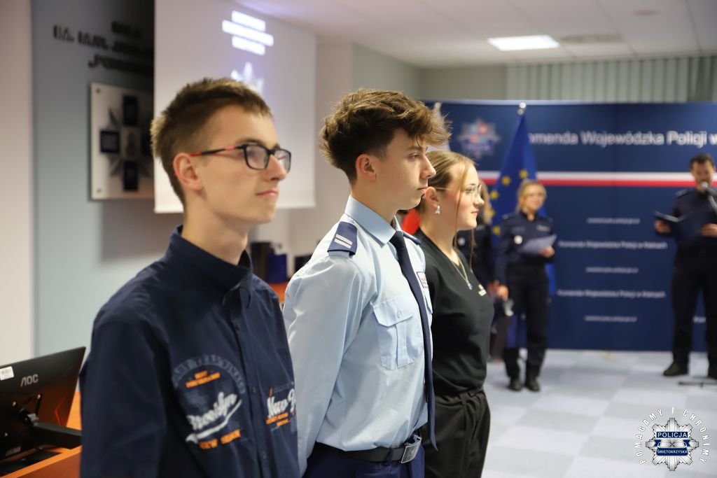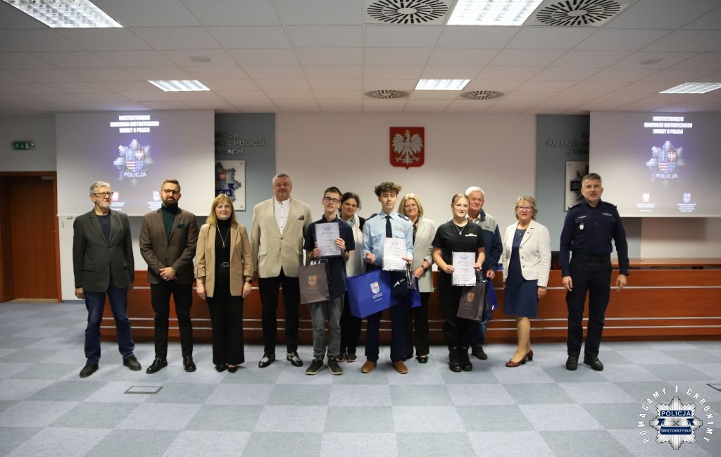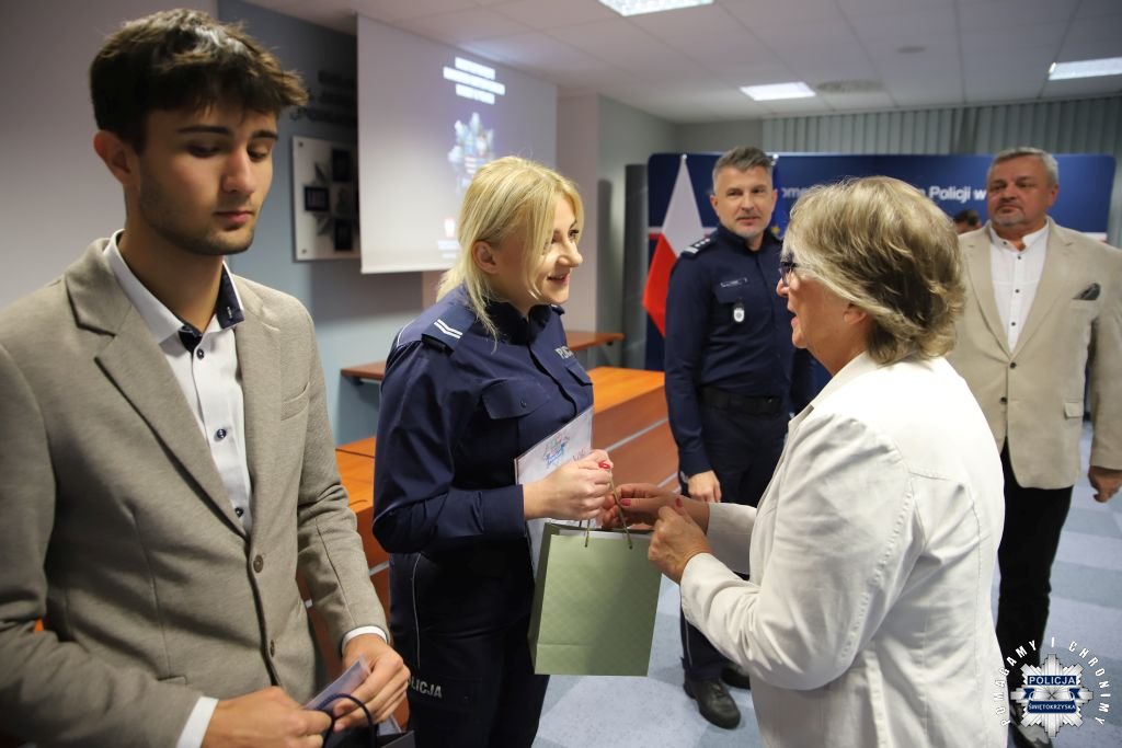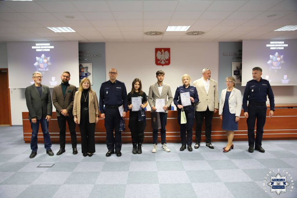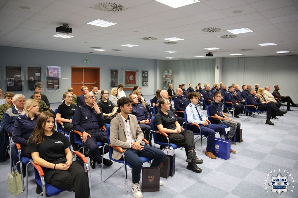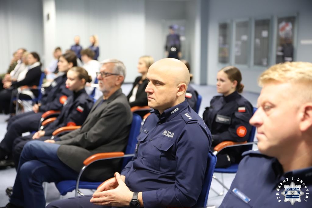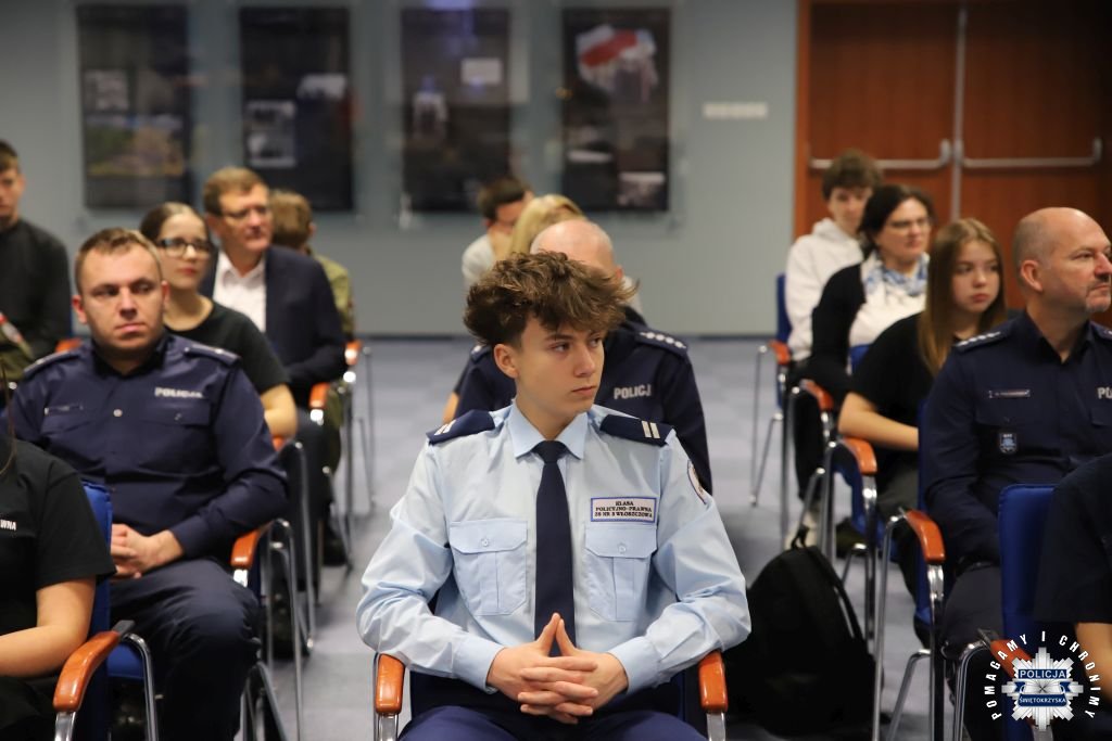 Dziś, na tej samej sali zebrali się wyróżnieni uczestnicy konkursu, przedstawiciele szkół, urzędów oraz świętokrzyskiej Policji aby podsumować rywalizację. Była to także okazja, by wspólnie uczcić tradycję formacji, która od 106 lat stoi na straży bezpieczeństwa i porządku publicznego. Podczas uroczystości obecni mogli wysłuchać wykładu o początkach obecności kobiet w Policji – w tym roku przypada setna rocznica tego pięknego jubileuszu. Tą wiedzą wykazali się najlepsi uczestnicy konkursu, wśród których znajdowali się policjanci i uczniowie.