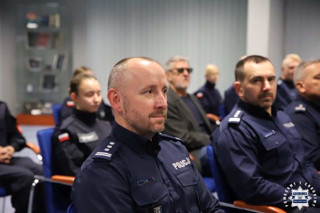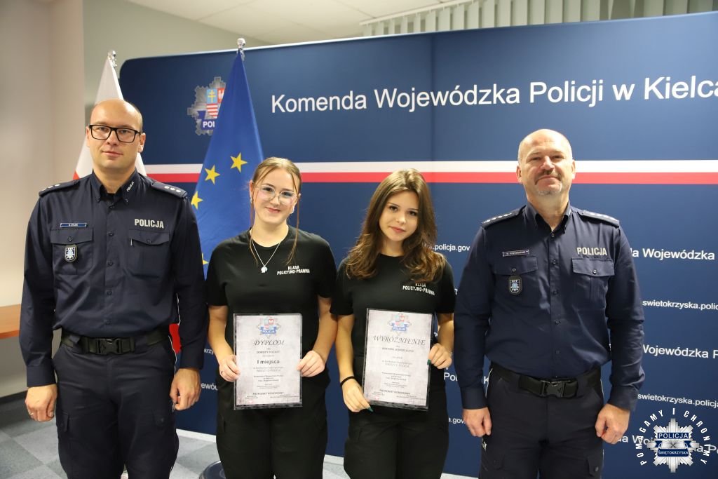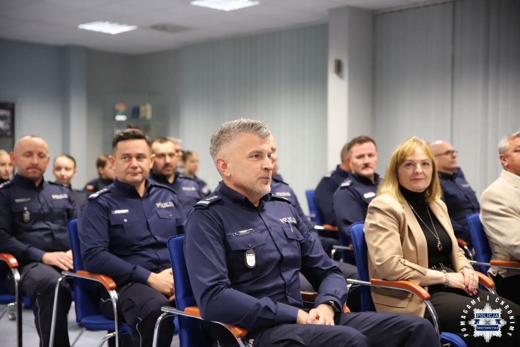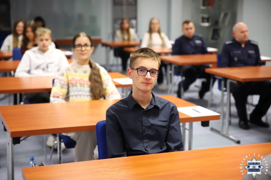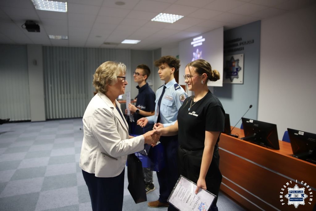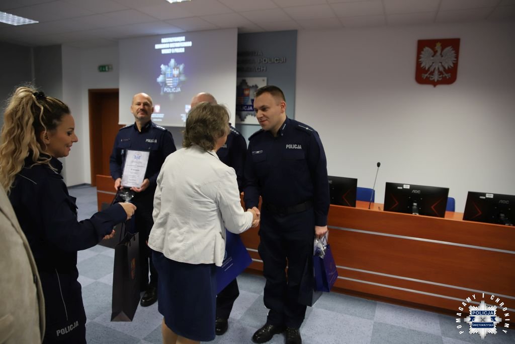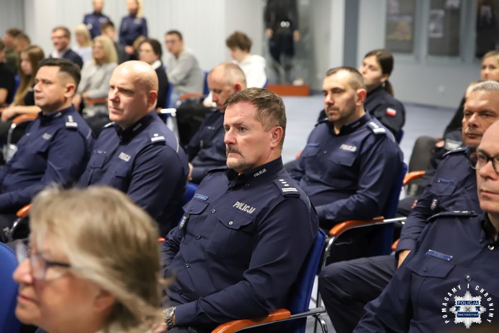 Dziś, na tej samej sali zebrali się wyróżnieni uczestnicy konkursu, przedstawiciele szkół, urzędów oraz świętokrzyskiej Policji aby podsumować rywalizację. Była to także okazja, by wspólnie uczcić tradycję formacji, która od 106 lat stoi na straży bezpieczeństwa i porządku publicznego. Podczas uroczystości obecni mogli wysłuchać wykładu o początkach obecności kobiet w Policji – w tym roku przypada setna rocznica tego pięknego jubileuszu. Tą wiedzą wykazali się najlepsi uczestnicy konkursu, wśród których znajdowali się policjanci i uczniowie.