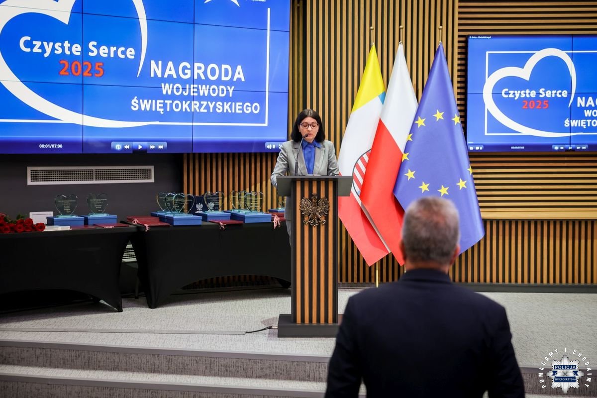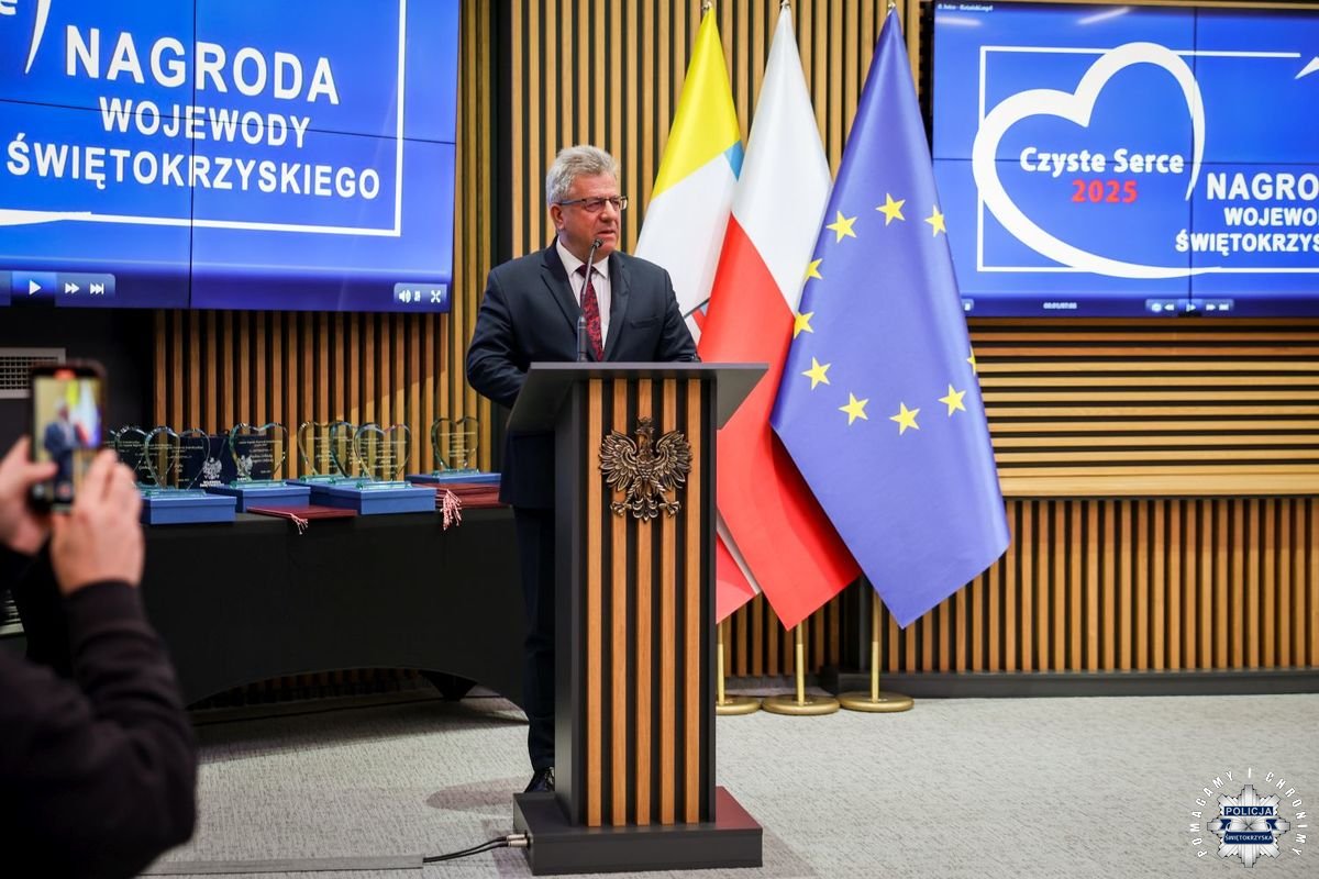 Wczoraj przed południem w Świętokrzyskim Urzędzie Wojewódzkim w Kielcach odbyła się wyjątkowa uroczystość wręczenia nagród „Czyste Serca”, w której udział wziął m.in. Komendant Wojewódzki Policji w Kielcach insp. Zbigniew Nowak oraz Komendant Miejski Policji w Kielcach insp. Wojciech Król. To honorowe wyróżnienie, przyznawane przez Wojewodę Świętokrzyskiego, stanowi wyraz uznania dla osób i instytucji działających bezinteresownie na rzecz mieszkańców regionu.