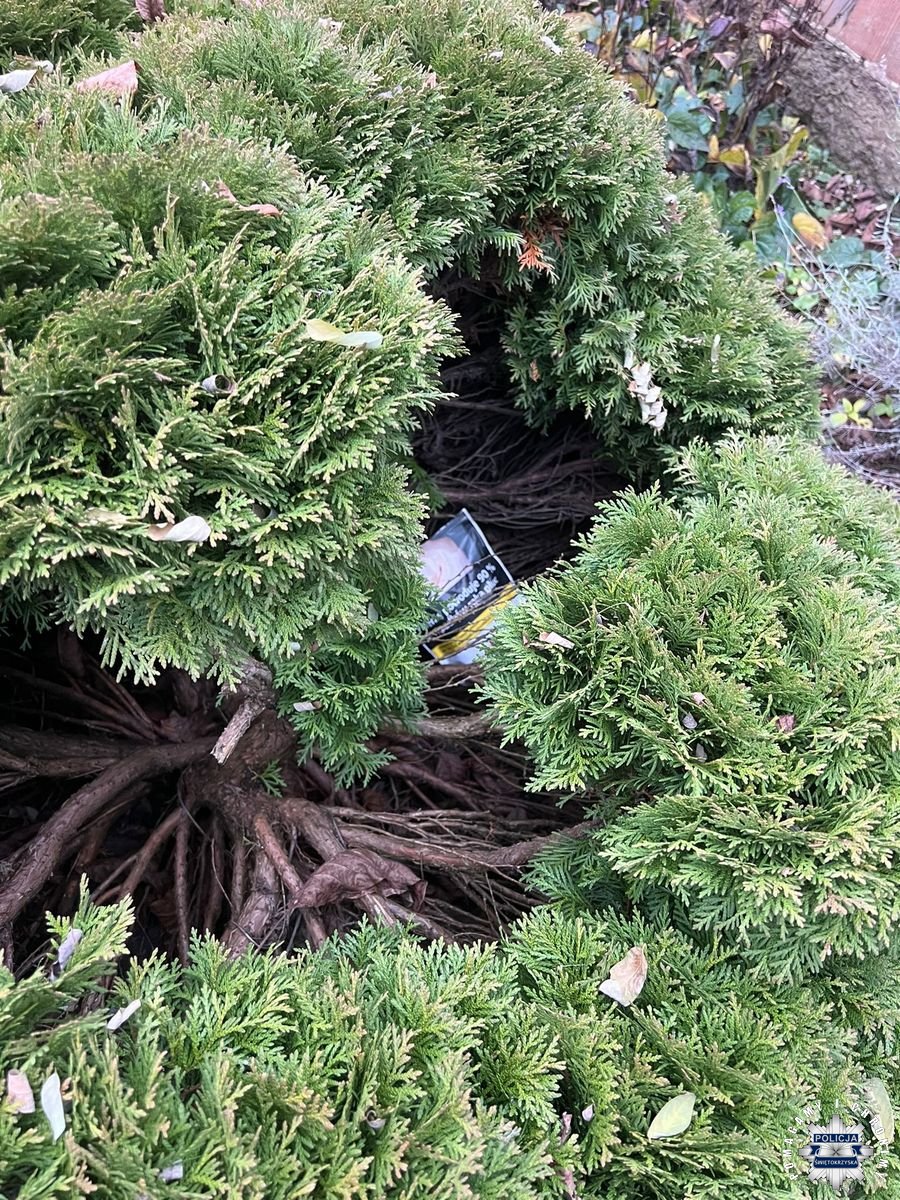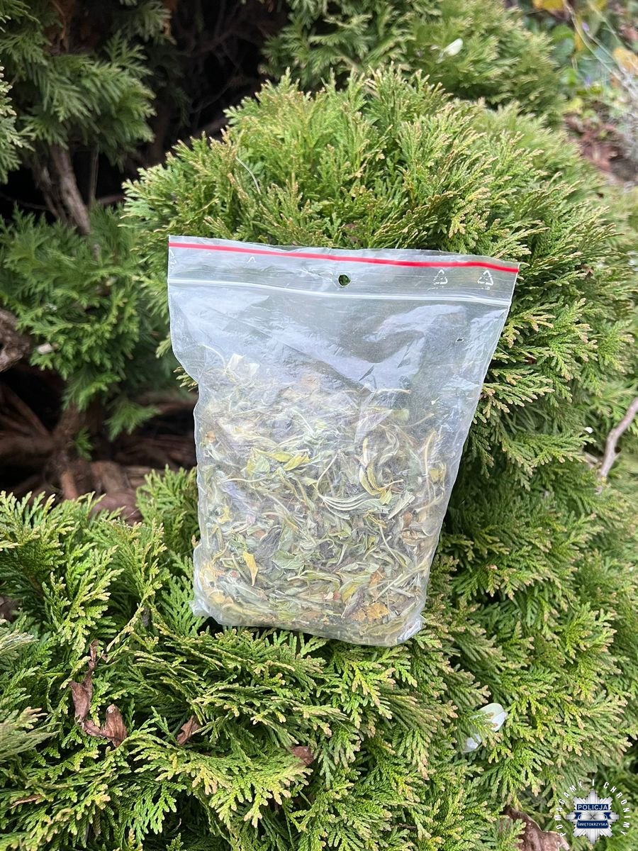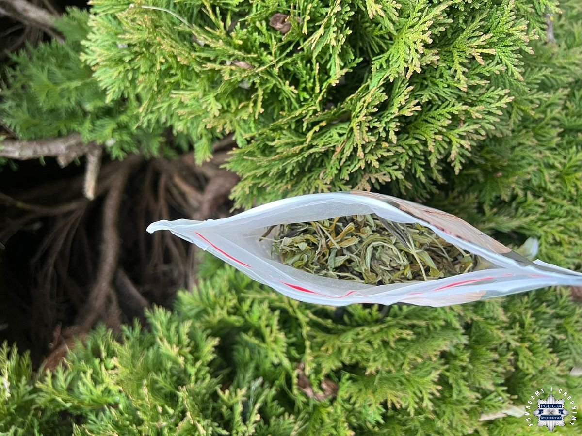 w związku z posiadaniem środków odurzających. W trakcie prowadzonych czynności funkcjonariusze ujawnili przy mężczyźnie 2 gramy substancji, wstępnie zidentyfikowanej jako amfetamina oraz 11 gramów suszu, wstępnie zakwalifikowanego jako marihuana. Po zatrzymaniu i zabezpieczeniu dowodów, wspólnie z policjantami Wydziału Kryminalnego sandomierskiej jednostki funkcjonariusze przeszukali miejsce zamieszkania podejrzewanego, gdzie ich uwagę przykuł krzew tui rosnący przed posesją. To właśnie w tej zielonej, gęstej roślinie ukryta była paczka z zwartością 60 gramów substancji, którą wstępnie zidentyfikowano jako marihuana.