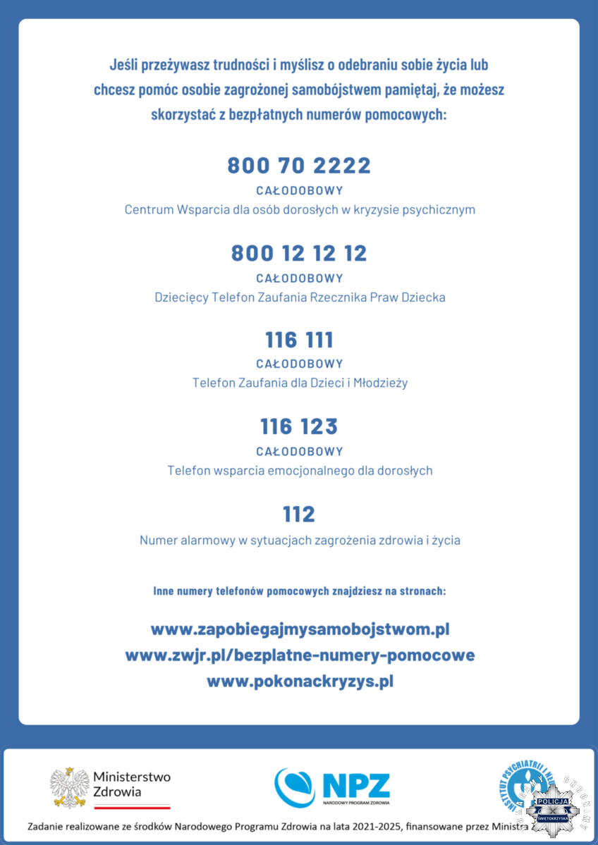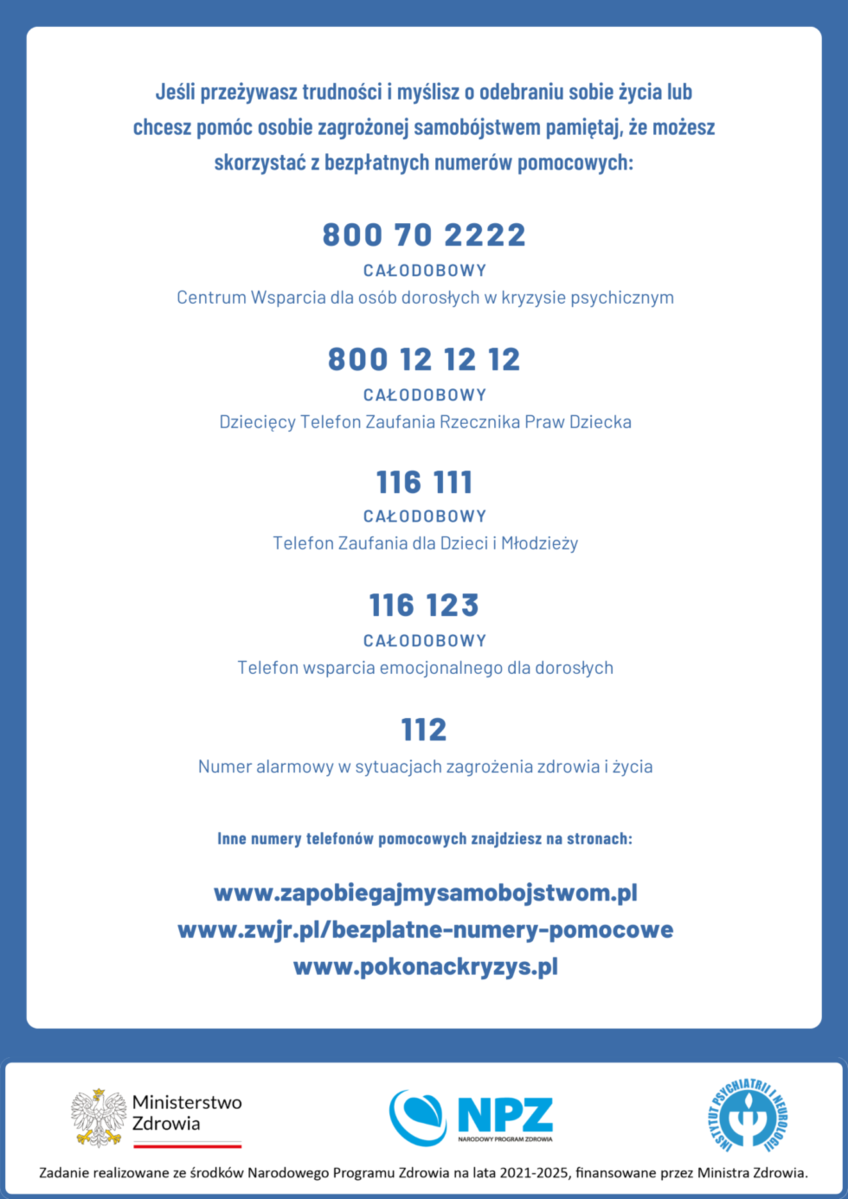 - Centrum Wsparcia dla Osób w Stanie Kryzysu Psychicznego - Fundacja Itaka – 800 70 2222 (bezpłatny, całodobowy);
