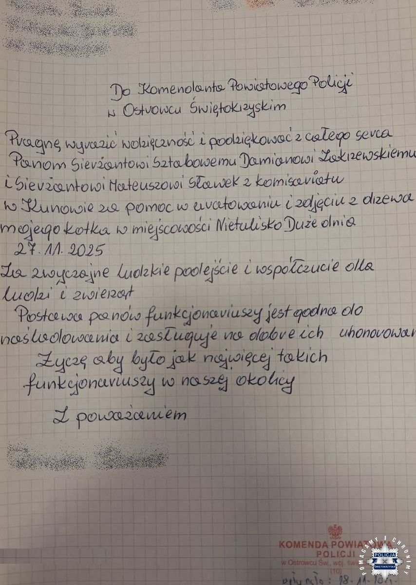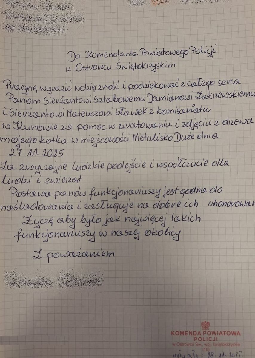 Na ręce Komendanta Powiatowego Policji w Ostrowcu Świętokrzyskim mł. insp. Wojciecha Szymczaka wpłynęły podziękowania od jednej z mieszkanek gminy Kunów. W ten sposób kobieta chciała wyrazić swoją wdzięczność funkcjonariuszom z Komisariatu Policji w Kunowie za okazaną pomoc w nietypowej sytuacji w jakiej znalazł się jej kot. Sierż. sztab. Damian Zakrzewski i sierż. Mateusz Sławek pomogli bowiem bezpiecznie sprowadzić pupila z wysokiego drzewa.