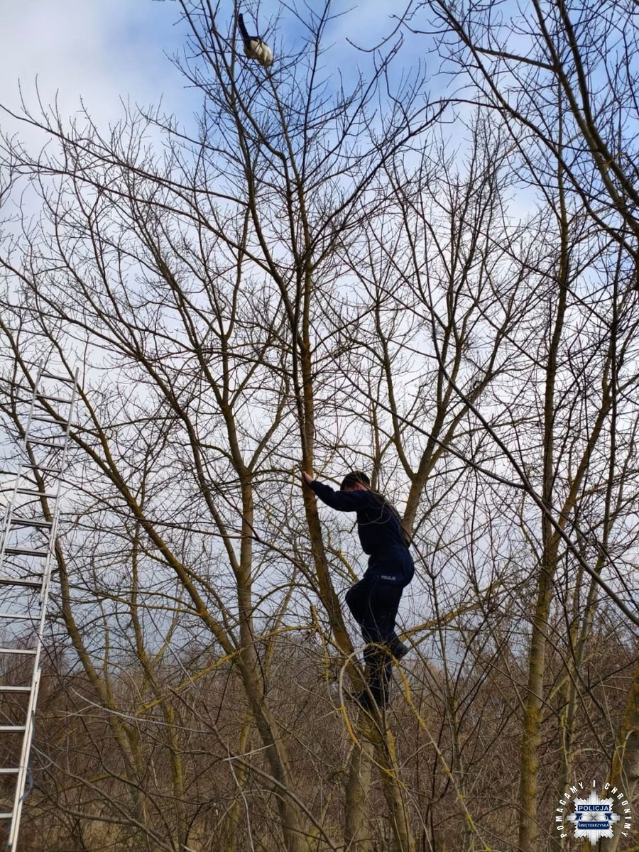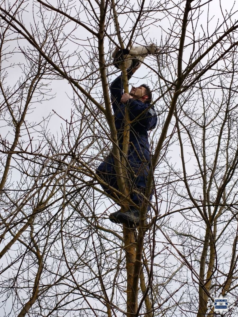 Kilka dni temu funkcjonariusze z Komisariatu Policji w Kunowie uczestniczyli w nietypowej interwencji. Podczas patrolowania jednej z miejscowości na terenie gminy Kunów zatrzymała ich roztrzęsiona kobieta. W rozmowie wyjaśniła, że jej kot przestraszył się innych zwierząt i wdrapał się na wysokie drzewo. Kobieta obawiała się, że zwierzę może spaść i zrobić sobie krzywdę. Nie tracąc czasu, postanowiła poprosić o pomoc sierż. sztab. Damiana Zakrzewskiego i sierż. Mateusza Sławek, którzy właśnie przejeżdżali obok. Mundurowi właściwie zareagowali na sytuację i bezpiecznie pomogli właścicielce zdjąć jej pupila z drzewa. Dzięki ich szybkiej i profesjonalnej interwencji zwierzę całe i zdrowe powróciło do swojej Pani.