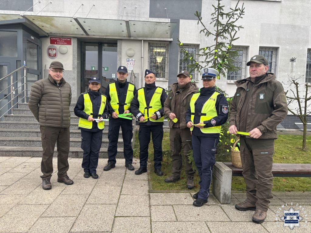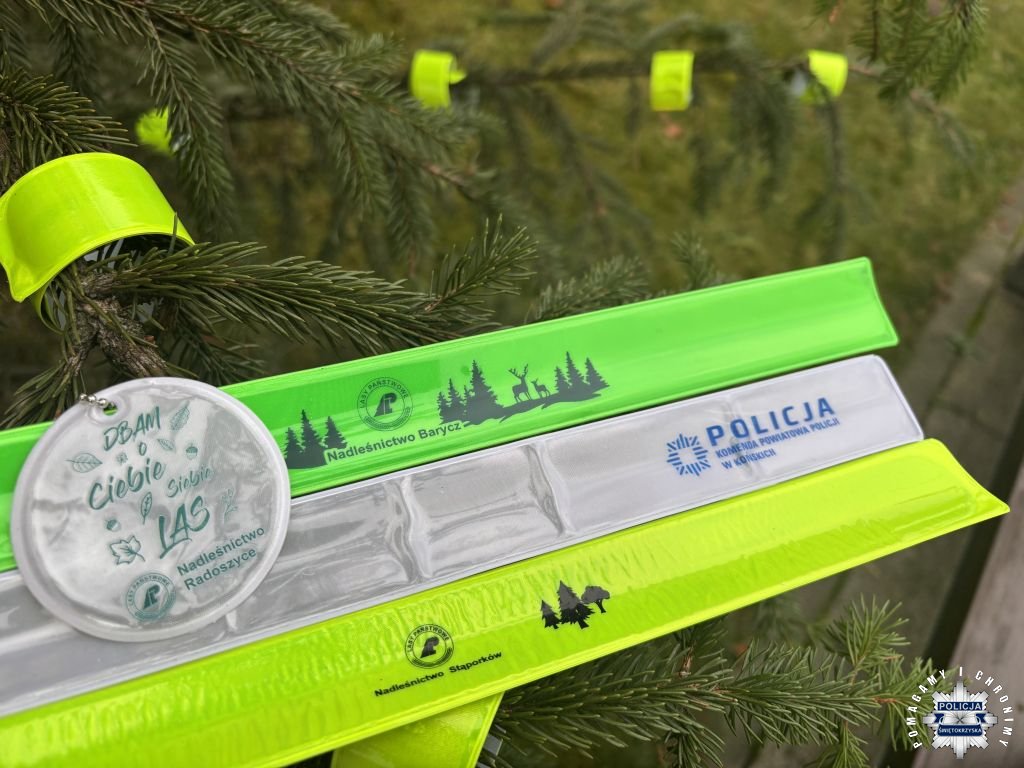 Tak jak w latach ubiegłych, również i w tym roku przed Komendą Powiatową Policji w Końskich stanęła wyjątkowa, odblaskowa choinka. Policjanci, wraz z przedstawicielami z Nadleśnictwa Barycz, Radoszyce, Stąporków, przystroili drzewko w wyjątkowe dekoracje. Na choince pojawiły się między innymi opaski odblaskowe. Przesłaniem tego pomysłu jest oczywiście bezpieczeństwo niechronionych uczestników ruchu drogowego. W ten sposób mundurowi przypomnieli bardzo ważny apel do mieszkańców powiatu koneckiego, aby w okresie zimowym zadbali o swoje bezpieczeństwo, nosząc odblaski. Warto przypomnieć, że po zmroku pieszy czy rowerzysta, ubrany w ciemny strój dostrzegany jest przez kierujących pojazdami z odległości około 30 metrów. Elementy odblaskowe sprawiają, że stajemy się widoczni nawet z odległości kilkuset metrów. Te dodatkowe odległości pozwalają kierowcy odpowiednio zareagować, by bezpiecznie ominąć pieszego. W trosce o bezpieczeństwo wszystkich użytkowników dróg, zachęcamy każdego do noszenia odblasków nie tylko poza obszarem zabudowanym. Każdy może przyjść przed komendę i zabrać z odblaskowej choinki całkowicie za darmo ten wyjątkowy prezent dla siebie. Dziękujemy Nadleśnictwu Barycz, Radoszyce oraz Stąporków za włączenie się w działania oraz przekazanie elementów odblaskowych.