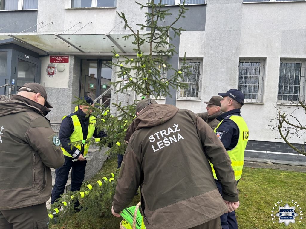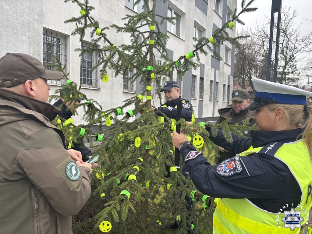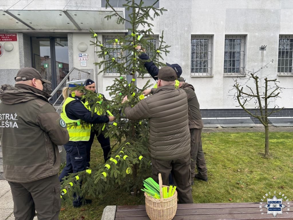 Choinka to nieodłączny element Świąt Bożego Narodzenia. Przed budynkiem Komendy Powiatowej Policji w Końskich już jest – wyjątkowa, bo odblaskowa, która jak żadna inna świeci przykładem. Funkcjonariusze z koneckiej jednostki Policji, wspólnie z przedstawicielami z Nadleśnictwa Barycz, Radoszyce, Stąporków, po raz kolejny ubrali świąteczną choinkę w elementy odblaskowe. Policjantom zależy, by każdy, kto potrzebuje odblasku, mógł go zabrać z choinki.