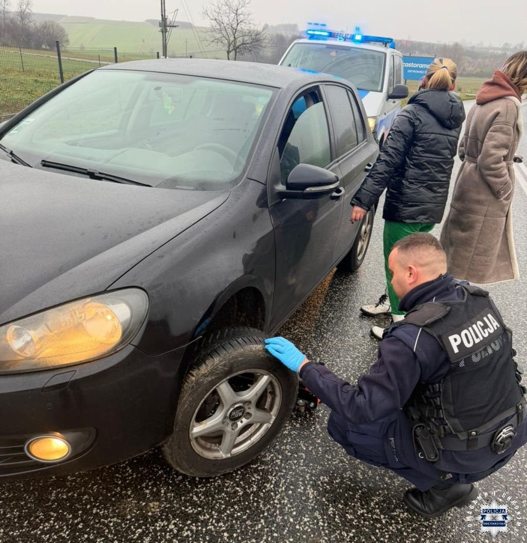 Wczoraj policjanci z ogniwa patrolowo-interwencyjnego ostrowieckiej komendy, jadąc przez miejscowość Śnieżkowice, na łuku drogi zauważyli stojący samochód oraz zdezorientowaną kobietę. W samochodzie kierującej podczas jazdy poluzowały się śruby koła i nie była w stanie jechać dalej. Mundurowi natychmiast zatrzymali radiowóz i ruszyli z pomocą. Funkcjonariusze zabezpieczyli miejsce zdarzenia, podnieśli lewarkiem pojazd i poprawnie zamontowali koło. Prawidłowe ustawienie koła i dokręcenie śrub wystarczyło by kobieta mogła bezpiecznie ruszyć w dalszą podróż.
