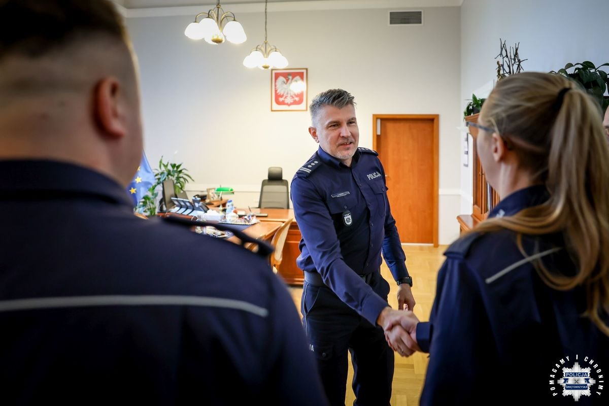 Dziś w gabinecie Komendanta Wojewódzkiego Policji w Kielcach, insp. Zbigniew Nowak spotkał się z post. Klaudią Dach i sierż. Jakubem Tomczykiem ze starachowickiej jednostki, którzy uratowali życie mężczyzny, wyciągając go z płonącego domu. Szef świętokrzyskich policjantów pogratulował funkcjonariuszom odwagi i determinacji oraz wyraził słowa uznania, iż ryzykowali własne życie, by uratować 37-latka.