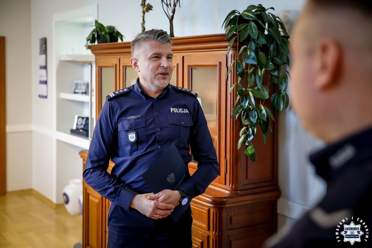 Dziś Komendant Wojewódzki Policji w Kielcach insp. Zbigniew Nowak zaprosił do swojego gabinetu post. Klaudię Dach i sierż. Jakuba Tomczyka z Komendy Powiatowej Policji w Starachowicach. Funkcjonariusze Ci w miniony piątkowy wieczór zostali skierowani na pilną interwencję, w związku z pożarem domu, w którym miał znajdować się mężczyzna. Starachowiccy policjanci dotarli na miejsce jako pierwsi, a od osób stojących przed budynkiem dowiedzieli się, że w środku może znajdować się osoba, która potrzebuje pomocy. Bez chwili zawahania mundurowi wraz ze świadkiem weszli do zadymionego domu, gdzie pod zawalonym stropem zauważyli leżącego na podłodze mężczyznę. Funkcjonariusze wraz ze świadkiem podnieśli część zawalonego stropu i wyciągnęli spod niego 37-latka. Poszkodowany mężczyzna następnie trafił pod opiekę ratowników medycznych, którzy przetransportowali go do szpitala.