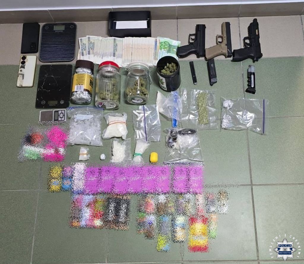 Funkcjonariusze Komendy Wojewódzkiej Policji w kielcach z Wydziału do walki z Przestępczością Narkotykową, już od pewnego czasu podejrzewali, że w jednym z mieszkań na KSM-ie może mieć miejsce przestępczy proceder. Skrupulatnie prowadzone czynności doprowadziły policjantów do 36-latka, karanego w przeszłości za narkotykowe przestępstwa. W miniony wtorek policjanci złożyli służbową wizytę w mieszkaniu mężczyzny. Podczas przeszukania funkcjonariusze zabezpieczyli 400 gramów mefedronu, 350 gramów marihuany, 100 gramów haszyszu oraz 30 gramów amfetaminy. Ponadto do badań trafiły trzy przedmioty przypominające broń planą krótką – ekspertyza wykaże czy na ich posiadanie wymagane jest pozwolenie. Policjanci w mieszkaniu znaleźli także gotówkę w kwocie kilkudziesieciu tysięcy złotych.
