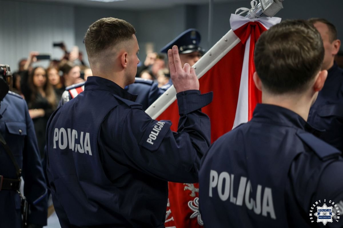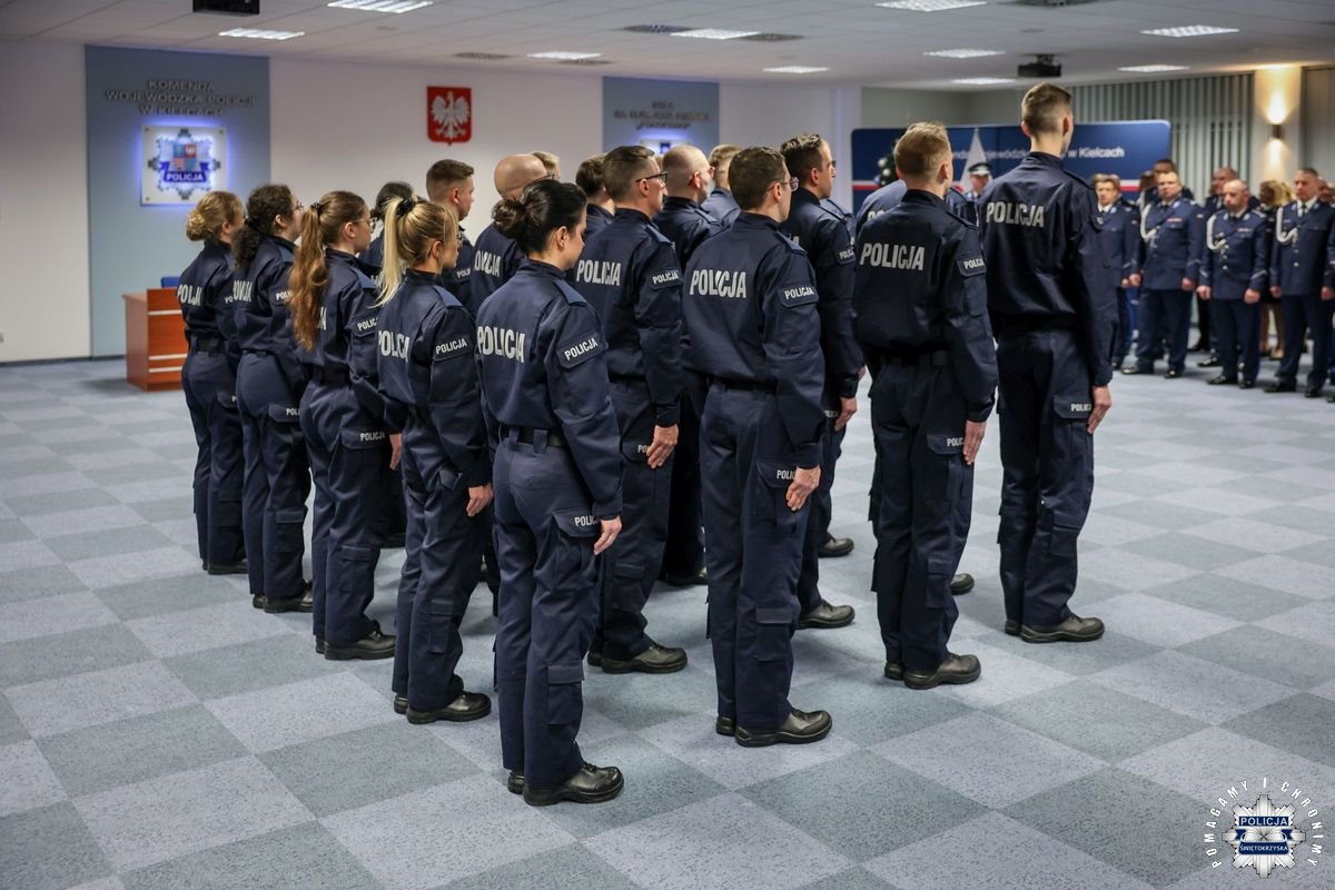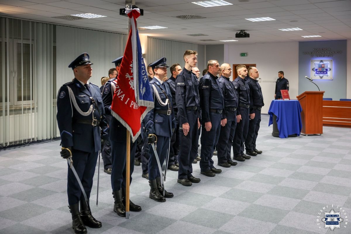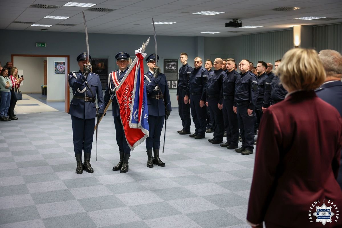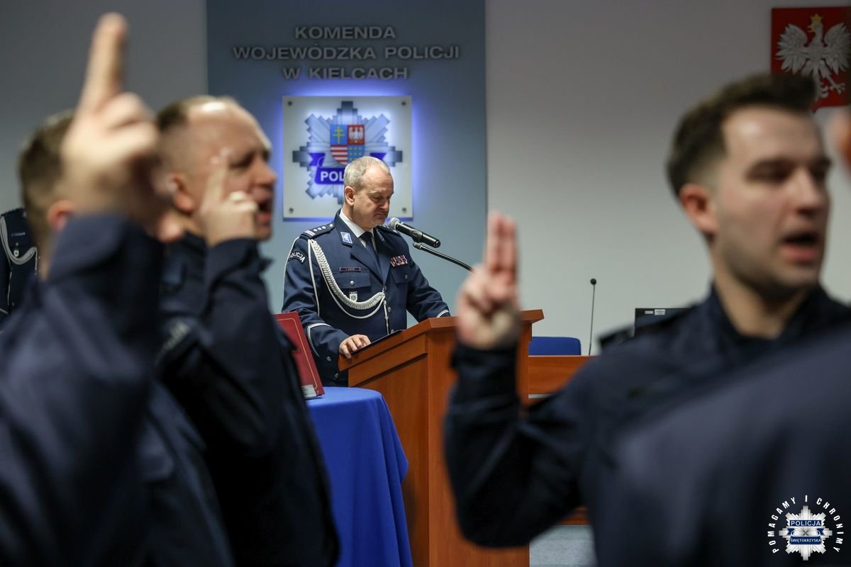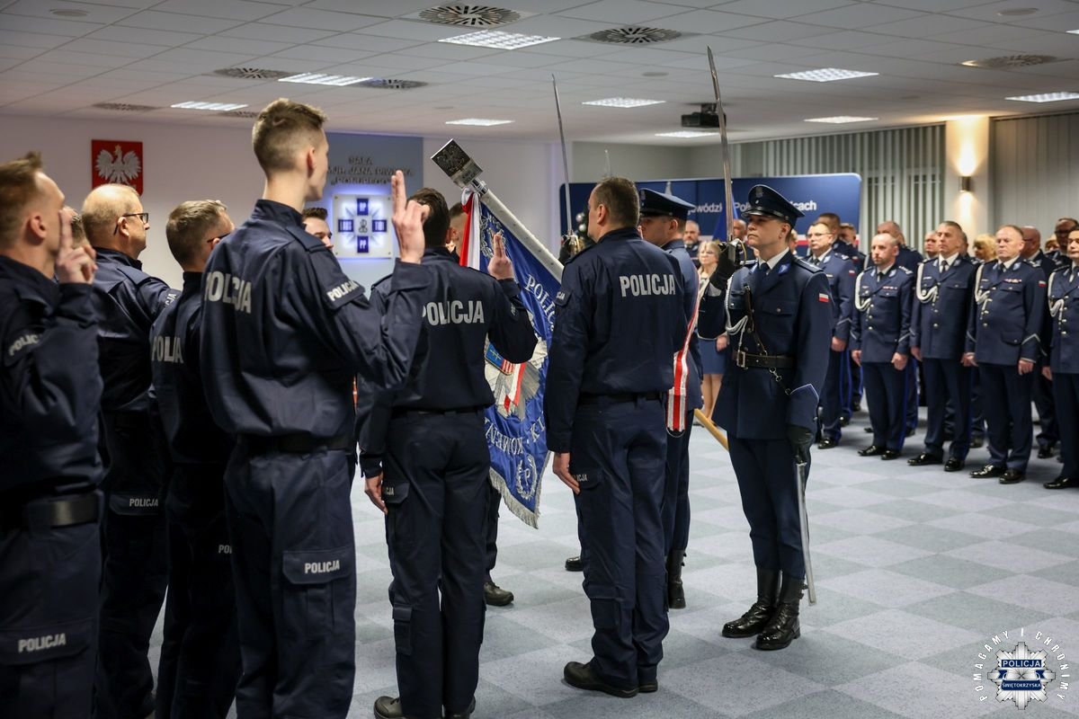 Przed podjęciem swojej służby, każdy z przyjętych policjantów złożył ślubowanie na sztandar według roty, którą odczytał insp. Tomasz Jarosz. Po chwili wiceszef świętokrzyskich stróży prawa powitał nowych funkcjonariuszy w szeregach formacji. Błogosławieństwa nowo przyjętym do służby udzielił kapelan świętokrzyskich policjantów – ksiądz podporucznik Paweł Kowalski.