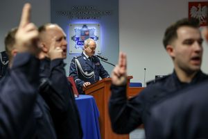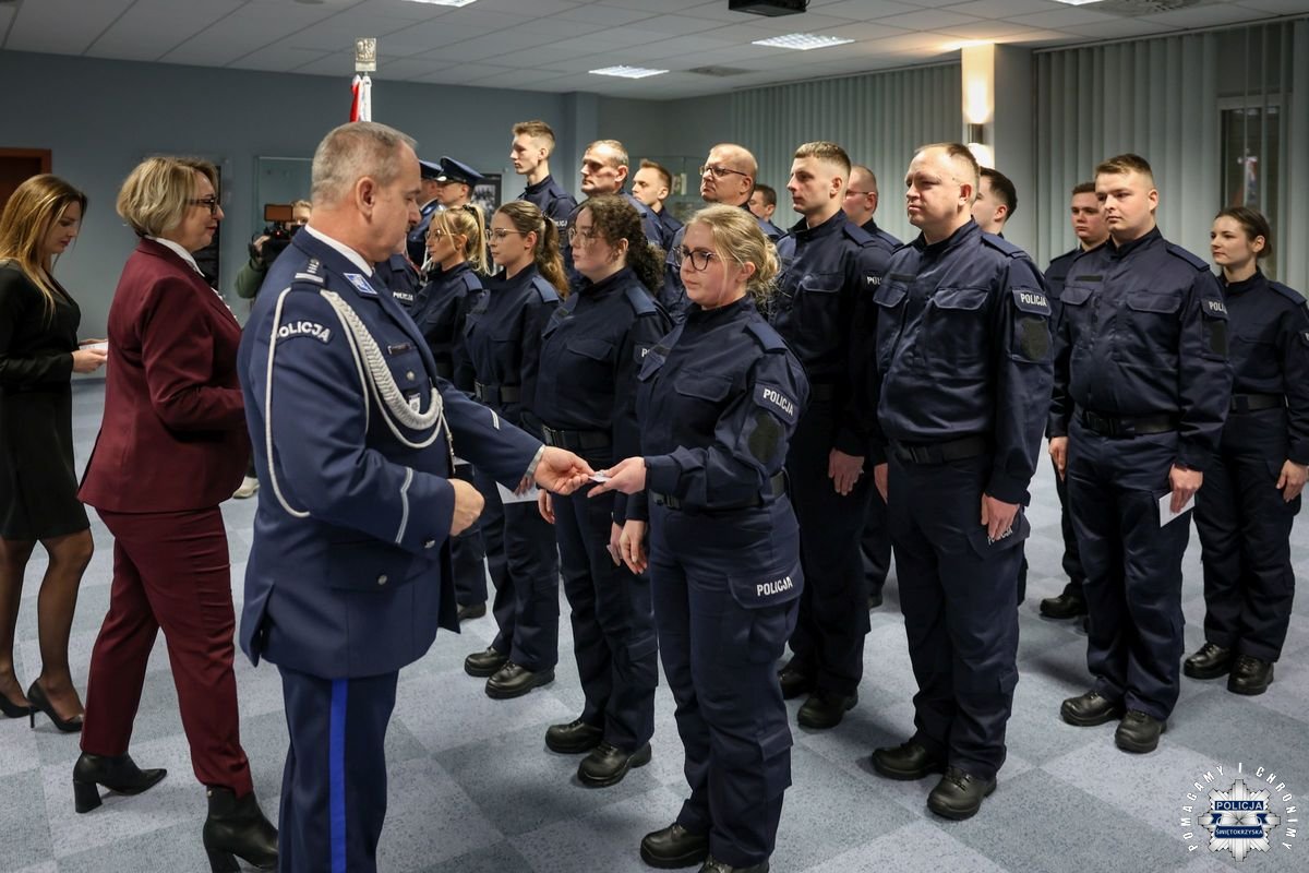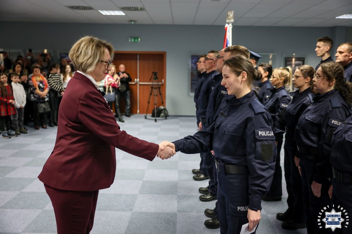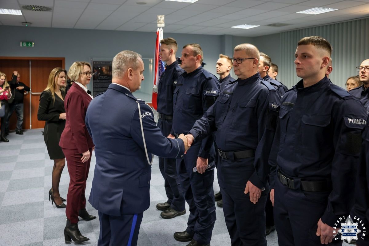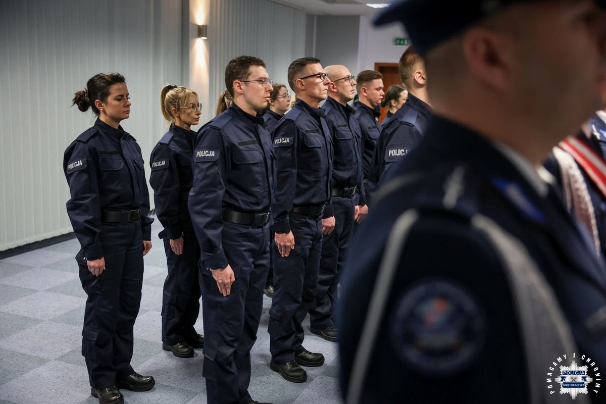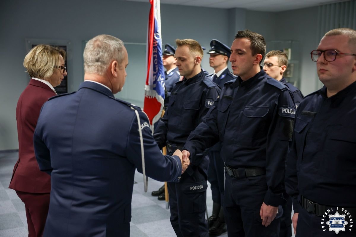 Przed podjęciem swojej służby, każdy z przyjętych policjantów złożył ślubowanie na sztandar według roty, którą odczytał insp. Tomasz Jarosz. Po chwili wiceszef świętokrzyskich stróży prawa powitał nowych funkcjonariuszy w szeregach formacji. Błogosławieństwa nowo przyjętym do służby udzielił kapelan świętokrzyskich policjantów – ksiądz podporucznik Paweł Kowalski.