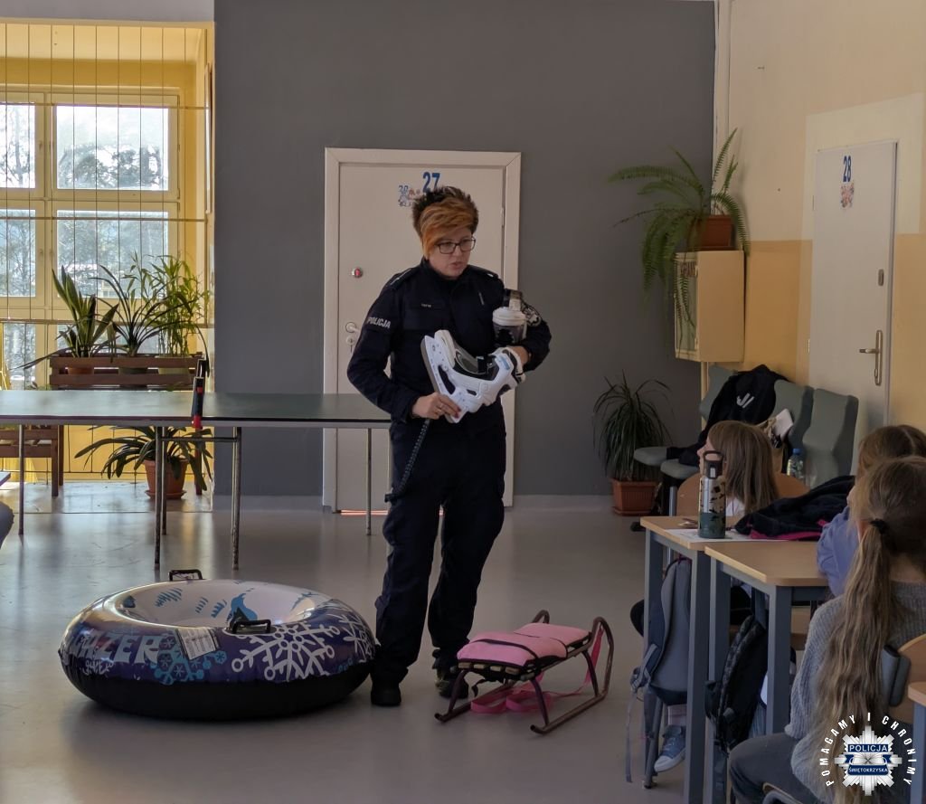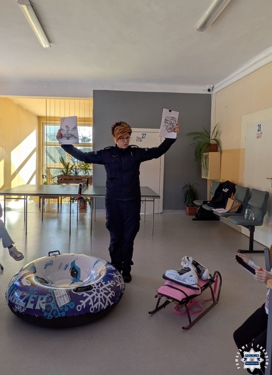 Spotkania te odbywają się w szkołach, zimowiskach jak również na terenie naszej jednostki, realizowane w ramach działań profilaktyczno - edukacyjnych „Bezpieczne Ferie” i „Kręci mnie bezpieczeństwo w zimie” których partnerami są: Stowarzyszenie Instruktorów i Trenerów Narciarstwa Polskiego Związku Narciarskiego, Stowarzyszenie Instruktorów i Trenerów Snowboardu, Górskie Ochotnicze Pogotowie Ratunkowe, Tatrzańskie Ochotnicze Pogotowie Ratunkowe, Polskie Stacje Narciarskie i Turystyczne oraz PZU S.A. W dniu dzisiejszym nasi stróże prawa odwiedzili kolejne już zimowisko, tym razem zorganizowane w Szkole Podstawowej nr 4 Skarżysko Kamienna. Celem spotkania było promowanie odpowiedzialnych postaw osób przebywających na stoku oraz poszerzenie wiedzy na temat szeroko pojętego bezpieczeństwa w zimie. W trakcie spotkania rozmawiano z dziećmi o tym ,gdzie nie należy jeździć na sankach oraz jak zachowywać się na stokach, czy też lodowiskach. Przestrzegano przed wchodzeniem na zmarznięte jeziora i zbiorniki wodne. Nie zabrakło również rozmów o bezpiecznym zachowaniu w ruchu drogowym. Dużo czasu poświęcono także na bezpieczeństwo dzieci i młodzieży pozostających w czasie ferii w miejscu zamieszkania. Przypominając o zachowaniu w kontaktach z osobami obcymi oraz zagrożeniach jakie niesie ze sobą nieumiejętne korzystanie z Internetu. Podczas spotkania wręczono najmłodszym drobne upominki oraz odblask, uświadamiając przy tym ich bardzo ważną rolę życiu codziennym. Zaproszono do udziału w konkursie plastyczno-filmowym pn. „Zimowy Dekalog”.