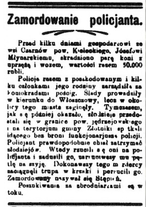Podczas pełnienia służby 20 czerwca 1920 r. został zamordowany post. Józef Stępień z Posterunku w Nagłowicach. Na podstawie dokumentów można odtworzyć przebieg zdarzenia. Gospodarzowi Józefowi Młynarskiemu, zamieszkałemu we wsi Czarnów pow. kielecki, skradziono parę koni z uprzężą i wozem o wartości łącznej 50 000 rubli. Policja wspólnie z poszkodowanym i członkami jego rodziny zarządziła za koniokradami pościg. Ślady prowadziły w kierunku Włoszczowy, lecz w okolicy tego miasta zaginęły. Jak się okazało, złodzieje skierowali się na teren pow. pow. jędrzejowskiego. W okolicach gminy Złotniki napotkali idącego bez broni funkcjonariusza Policji Państwowej. Był to post. Józef Stępień. Policjant prawdopodobnie chciał zatrzymać złodziei, którzy rzucili się na niego i udusili go poprzez zarzuceni mu pętli na szyję, a następnie zaciągnęli ofiarę w krzaki. Post. Stępień osierocił żonę Agnieszkę i pięcioro dzieci. Działania policji doprowadziły do ujęcia sprawców mordu, Franciszka Mitrę vel Skalskiego zatrzymano w domu, a Jana Imiałka w Częstochowie.