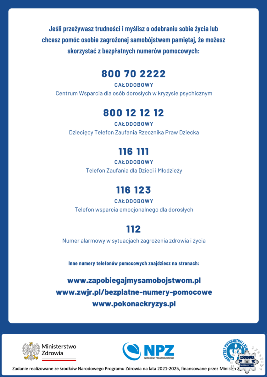 Zadzwoń na telefony zaufania: 800 70 2222 (Centrum Wsparcia dla Dorosłych) lub 116 123 (dla dorosłych), a także 116 111 (dla dzieci i młodzieży).