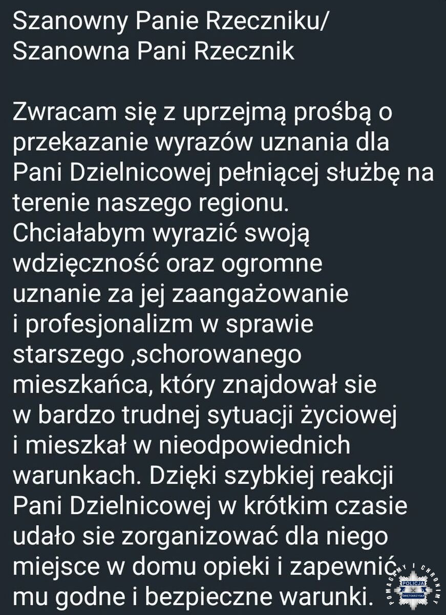 Na służbowy telefon Oficera Prasowego Komendy Miejskiej Policji w Kielcach wpłynęły serdeczne podziękowania od kobiety, która wyraziła wdzięczność za profesjonalne i pełne zaangażowania działania dzielnicowej. Krótko po tym jak do funkcjonariuszki z Komisariatu Policji w Daleszycach dotarła informacja o samotnie mieszkającym w skrajnie trudnych warunkach 85-latku, podjęła odpowiednie kroki. Dzięki nim senior otrzymał fachową pomoc.
