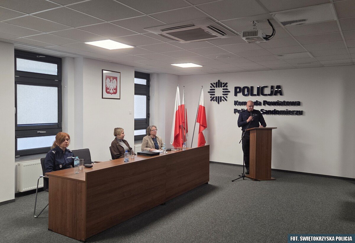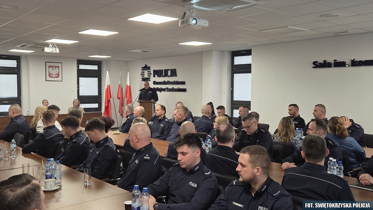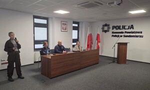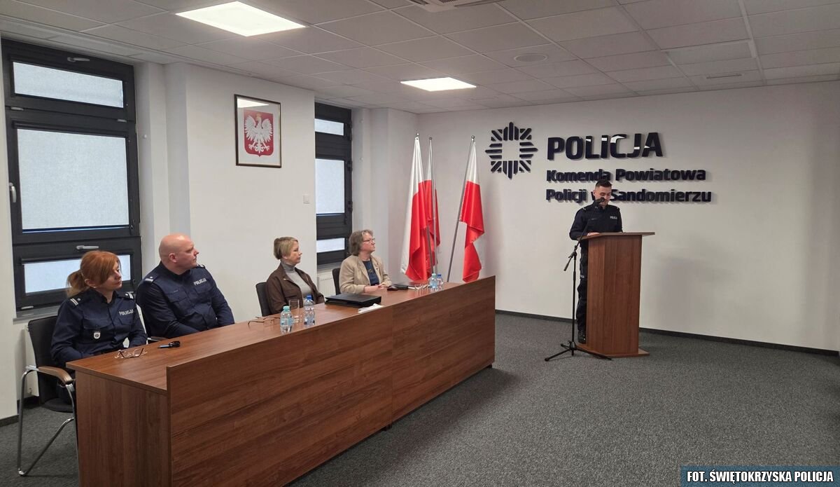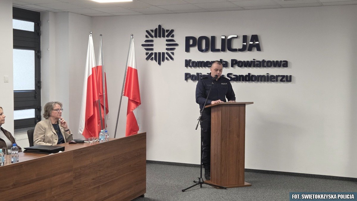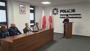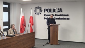 Na wstępie, Komendant Powiatowy Policji w Sandomierzu podinspektor Grzegorz Jaworski przywitał zaproszonych gości, wśród których znaleźli się: Pełnomocnik Komendanta Wojewódzkiego Policji w Kielcach ds. Ochrony Praw Człowieka, podinspektor Joanna Michałek, Prezes Świętokrzyskiego Stowarzyszenia „Rodzina Policyjna 1939” w Kielcach, Pani Grażyna Szkonter, Pełnomocnik Komendanta Wojewódzkiego Policji w Kielcach ds. Fundacji Pomocy Wdowom i Sierotom po Poległych Policjantach, Pani Paula Przybylska, rodzina śp. inspektora Ryszarda Komańskiego, żona Dorota i brat Stanisław Komański, a także młodszego aspiranta Andrzeja Patra, żona Joanna wraz z synem Dawidem oraz funkcjonariusze i pracownicy cywilni sandomierskiej jednostki.