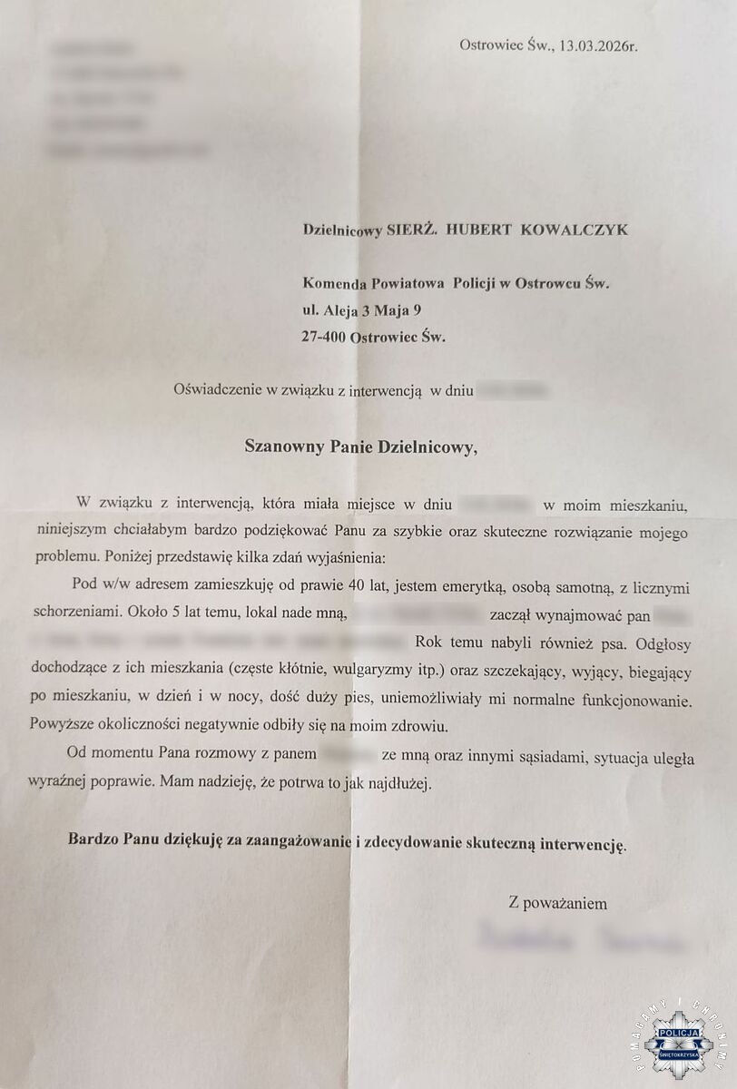 Kilka dni temu informowaliśmy o wyrazach wdzięczności skierowanych do sierż. Huberta Kowalczyka dzielnicowego z Komendy Powiatowej Policji w Ostrowcu Świętokrzyskim. Dziś z satysfakcją przekazujemy wiadomość, że ponownie do naszej jednostki wpłynęły słowa uznania dla tego samego funkcjonariusza. To kolejny dowód na jego zaangażowanie, profesjonalne podejście oraz oddanie w codziennej służbie na rzecz mieszkańców.
