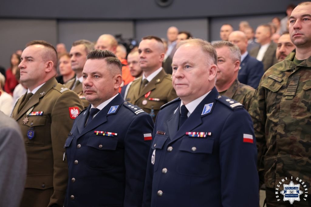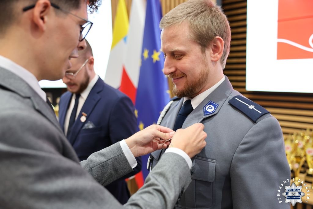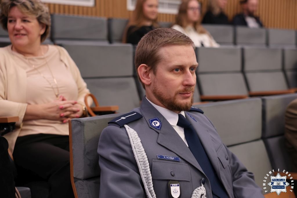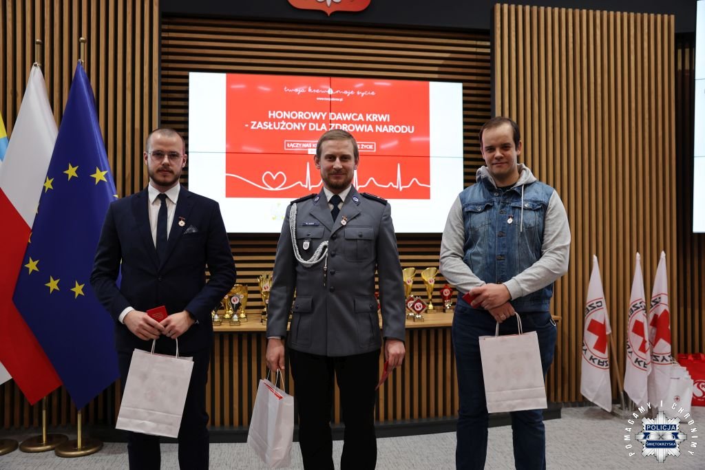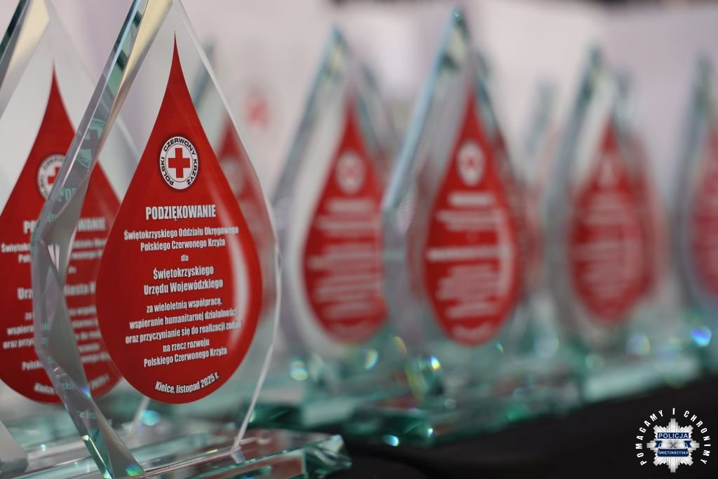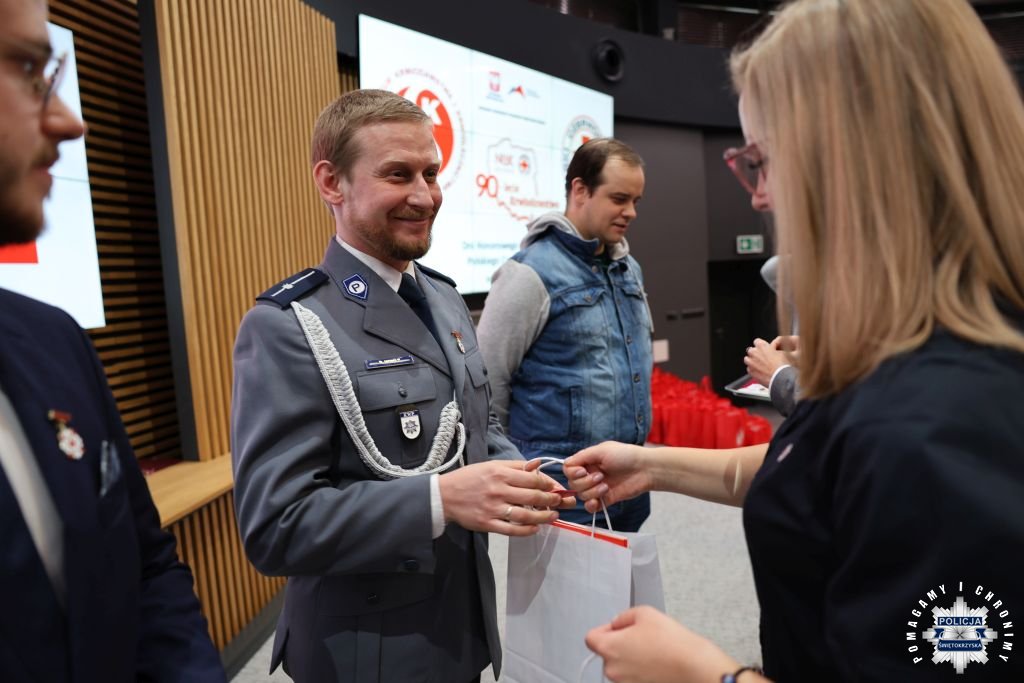 Wśród wyróżnionych znalazł się mł. asp. Radosław Nowak z Wydziału Zaopatrzenia Komendy Wojewódzkiej Policji w Kielcach, który odebrał odznakę Zasłużonego Honorowego Dawcy Krwi II Stopnia. Wśród osób, które w sposób szczególny wspierają krwiodawstwo znalazł się także nadkom. Mariusz Bednarski. W imieniu komisarza statuetkę odebrał jego przełożony – Naczelnik Wydziału Ruchu Drogowego Komendy Wojewódzkiej Policji w Kielcach mł. insp. Artur Putowski.