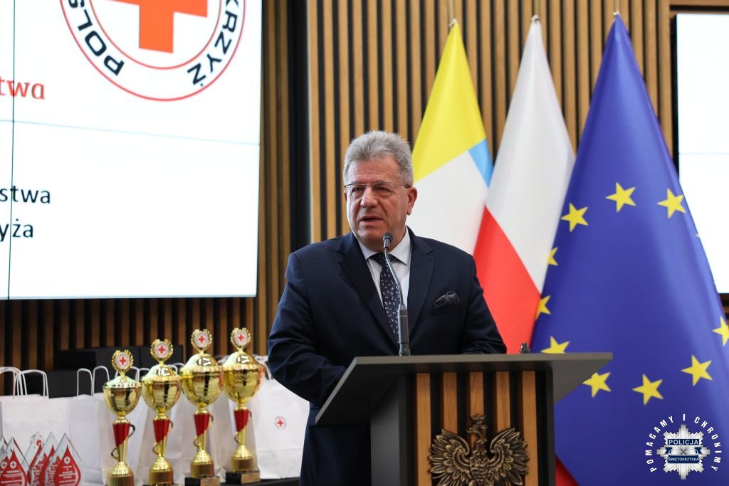W siedzibie Świętokrzyskiego Urzędu Wojewódzkiego odbyło się dziś spotkanie z okazji Dni Honorowego Krwiodawstwa. Wyróżniono krwiodawców oraz instytucje wspierające szlachetną działalność. Specjalne wyróżnienie, przyznane Komendzie Wojewódzkiej Policji w Kielcach odebrał zastępca szefa świętokrzyskich policjantów inspektor Jacek Cholewa.