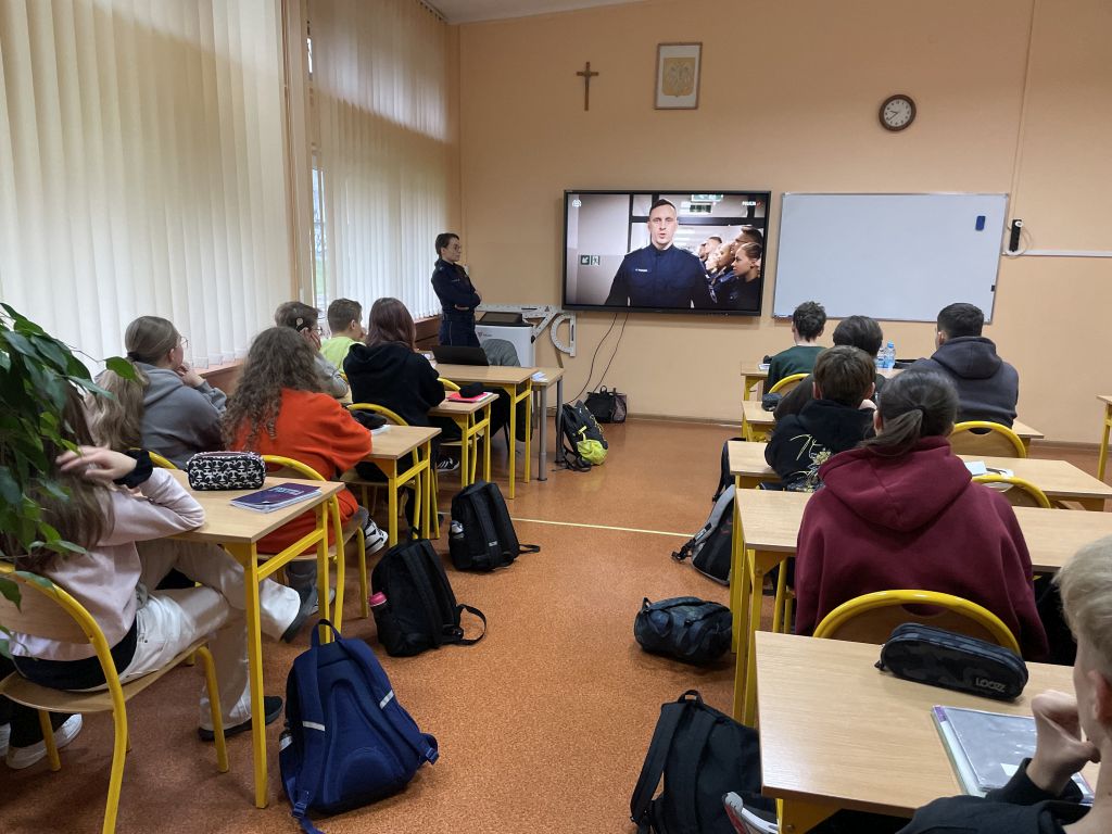Prelegentki rozpoczęły wystąpienie od omówienia zadań, jakie na co dzień realizuje policja. Podkreśliły, że praca policjanta nie ogranicza się wyłącznie do interwencji czy patrolowania ulic, lecz obejmuje także działania profilaktyczne, pomoc obywatelom, a także szereg czynności operacyjnych i dochodzeniowych. Zwróciły uwagę, że to zawód wymagający odpowiedzialności, opanowania i gotowości do niesienia pomocy w każdej sytuacji. W trakcie wykładu przedstawiono także ścieżki edukacyjne i zawodowe prowadzące do podjęcia służby w Policji. Uczniowie poznali etapy rekrutacji, takie jak test wiedzy, sprawdzian fizyczny, rozmowa kwalifikacyjna oraz badania lekarskie i psychologiczne. Funkcjonariuszki wyjaśniły, że choć konkretne kierunki studiów nie są wymagane, to nauka w klasach o profilu mundurowym czy bezpieczeństwie publicznym może znacząco ułatwić start zawodowy. Podkreślono również rolę dalszego kształcenia w szkołach policyjnych, gdzie nowo przyjęci funkcjonariusze zdobywają specjalistyczną wiedzę i praktyczne umiejętności. Spotkanie stało się także okazją do promocji klas mundurowych funkcjonujących w szkołach ponadpodstawowych. Policjantki zaznaczyły, że edukacja w takim profilu pomaga młodzieży rozwijać dyscyplinę, sprawność fizyczną, umiejętność pracy w zespole oraz podstawową wiedzę z zakresu bezpieczeństwa. Zajęcia praktyczne, musztra, warsztaty z pierwszej pomocy czy współpraca z lokalnymi służbami mundurowymi przygotowują uczniów do ewentualnej służby w przyszłości, ale również do odpowiedzialnego funkcjonowania w społeczeństwie.