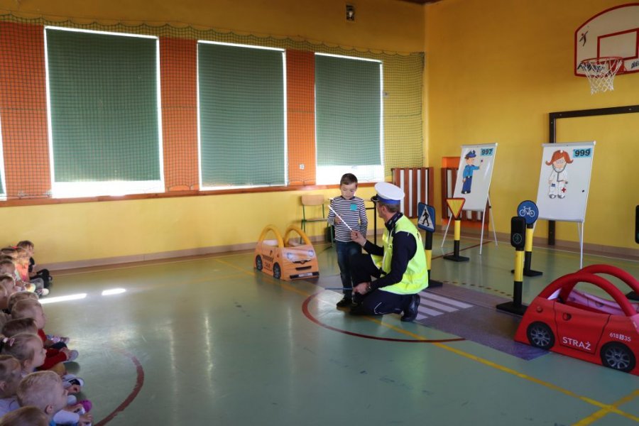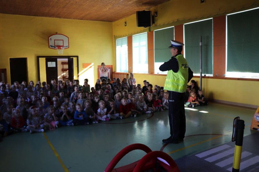 Policjanci z Wydziału Ruchu Drogowego Komendy Wojewódzkiej Policji w Kielcach wzięli udział w spotkaniu z najmłodszymi uczestnikami zajęć o bezpieczeństwie. W trakcie wspólnego spotkania z mundurowymi zaprezentowali najmłodszym jak bezpiecznie podróżować w pojeździe, dlaczego pasy bezpieczeństwa zapięte w foteliku są tak ważne i jaką rolę w bezpieczeństwie pieszych pełnią elementy odblaskowe. Nie zabrakło także ćwiczeń praktycznych w formie zabawy, gdzie dzieci brały czynny udział w utrwalaniu wiedzy i umiejętności przechodzenia w sposób prawidłowy przez przejście dla pieszych.